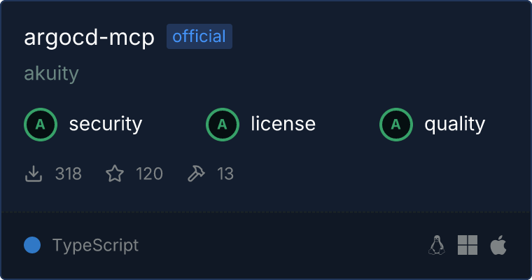 list_applications: List and filter all applicationsget_application: Get detailed information about a specific applicationcreate_application: Create a new applicationupdate_application: Update an existing applicationdelete_application: Delete an applicationsync_application: Trigger a sync operation on an applicationget_application_resource_tree: Get the resource tree for a specific applicationget_application_managed_resources: Get managed resources for a specific applicationget_application_workload_logs: Get logs for application workloads (Pods, Deployments, etc.)get_resource_events: Get events for resources managed by an applicationget_resource_actions: Get available actions for resourcesrun_resource_action: Run an action on a resourcegit clone https://github.com/akuity/argocd-mcp.git