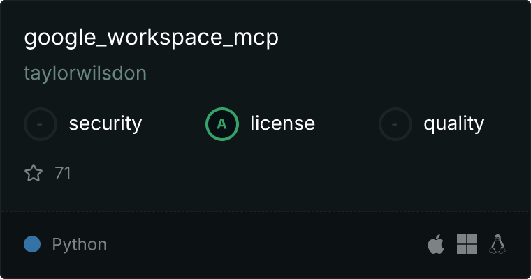 A production-ready MCP server that integrates all major Google Workspace services with AI assistants. Built with FastMCP for optimal performance, featuring advanced authentication handling, service caching, and streamlined development patterns.